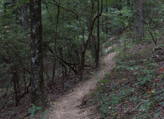 A bit of history. Alum Hollow Trail was pretty much already in place by this time. The western portion, over Alum Cave Ledge, had just recently been completed, but the eastern parts of it had existed as far back as when I was ten years old (that’s 1967) and my oldest brother had put a path over to the nearest creek, about a quarter mile from our house (hence, the name I call it; Quarter-mile Creek). In the 1990s, I was an avid runner and from time to time I would injure my knee. In order to ramp up to running on asphalt again, I needed a soft path. I put in a loop trail that was exactly 1 kilometer long, tying it into what is now Alum Hollow Trail where it runs along the bluff just east of Cruse Point. Our neighbors Kevin and Katey had also previously contributed eastern parts of the current trail to complete what we have today.