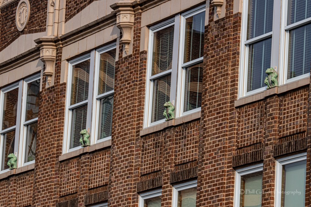 I have known about these for a long time as the only gargoyles in downtown Huntsville, but only recently took close-up photos showing their amphibian nature. They are on the top floor of the Terry-Hutchens Building at Jefferson and Clinton.